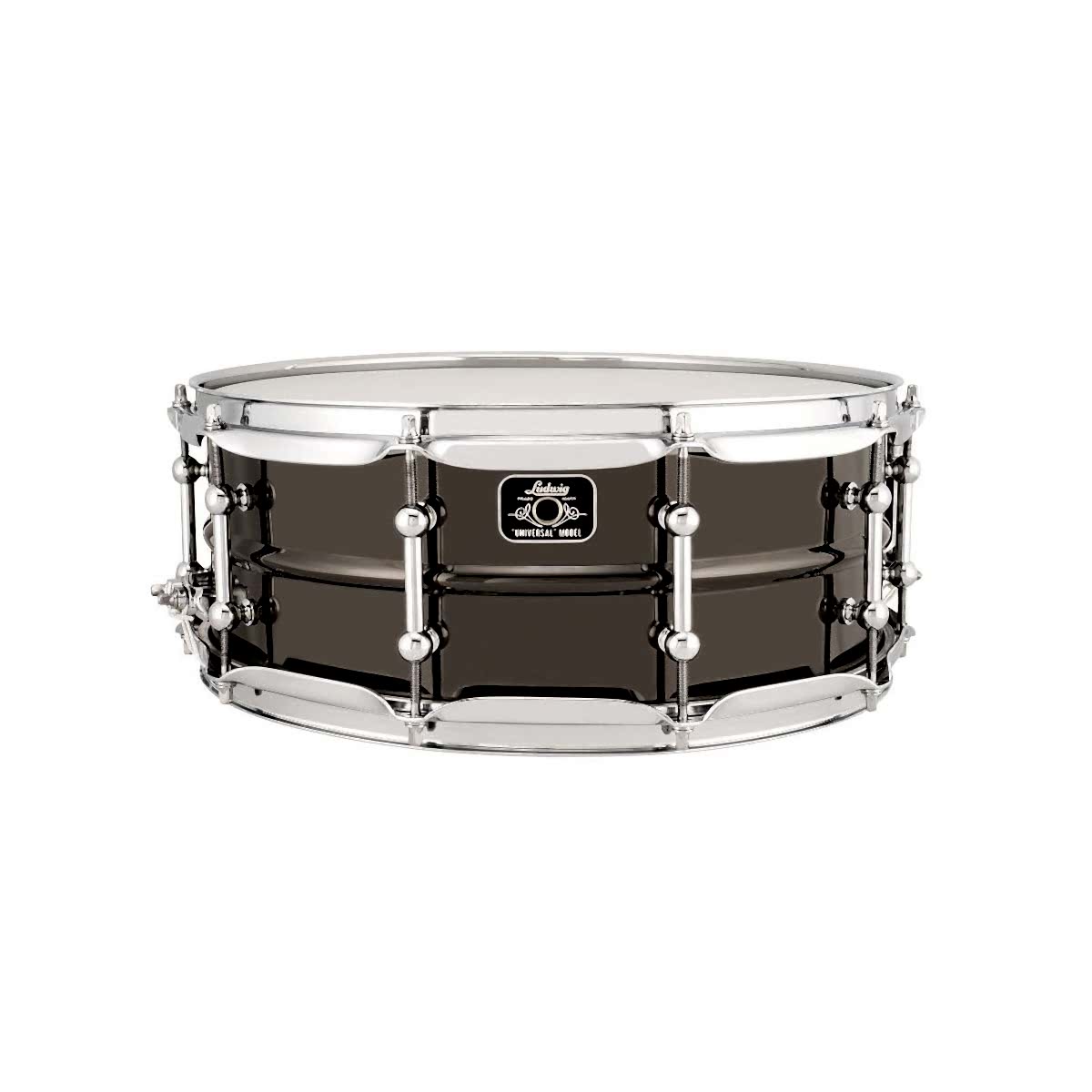 Ludwig 14×5.5 Universal Siyah Pirinç Trampet (LU5514C), 1mm boncuklu siyah nikel kaplama pirinç gövde, 45 derece kenar açısı, 10 tüp kulakçık, 2.3mm üçlü flanşlı çemberler, P88I atıcı mekanizma, P35 alt plaka, 20 telli pirinç bobin trampet telleri, Ludwig logolu Remo Coated UT vuruş kafa derisi, krom donanım ve Ludwig Universal Model rozeti ile donatılmıştır.